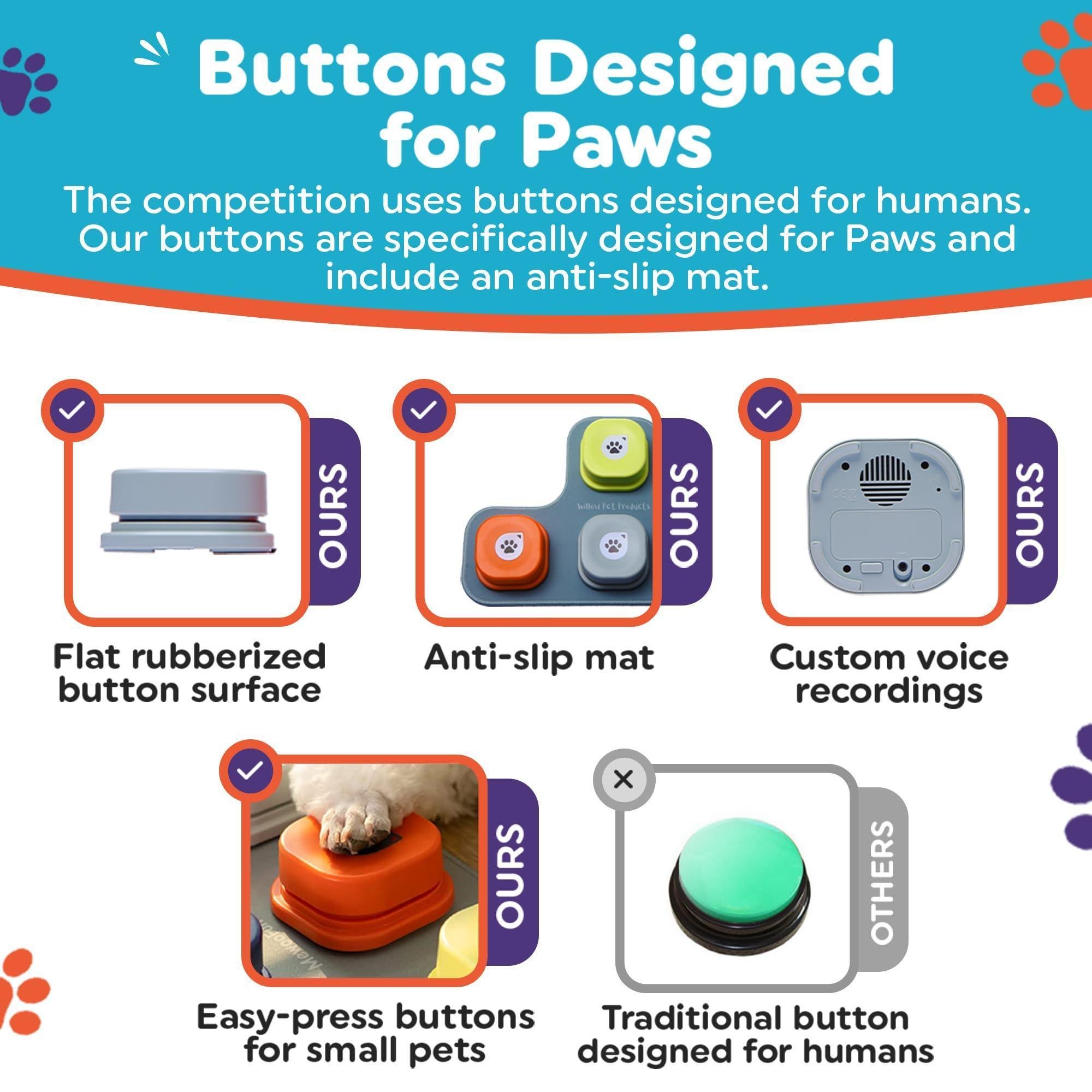 2.designed for paws: unlike our competitors, our dog speaking buttons are crafted specifically for paws, ensuring that your pets can easily interact with them. we believe in not just functionality, but also the comfort of your furry friends.