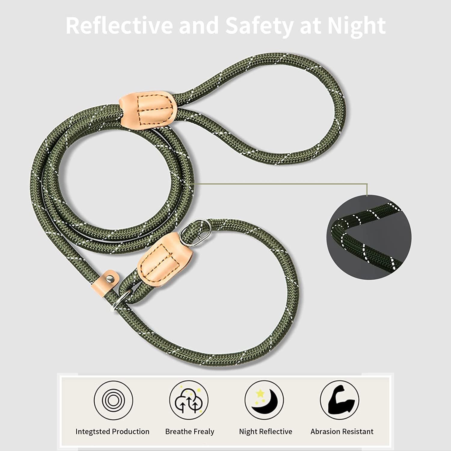 1.Strong and Durable Threads: We all use the quality rope, mental,leather and threads to ensure the strong and durable slip leash. Available in two thick sizes, 3/8" for small puppys, 1/2" for medium and large breeds.